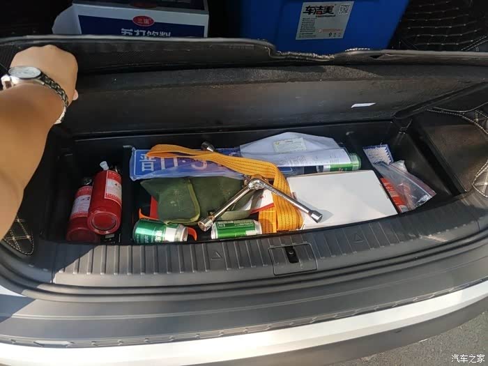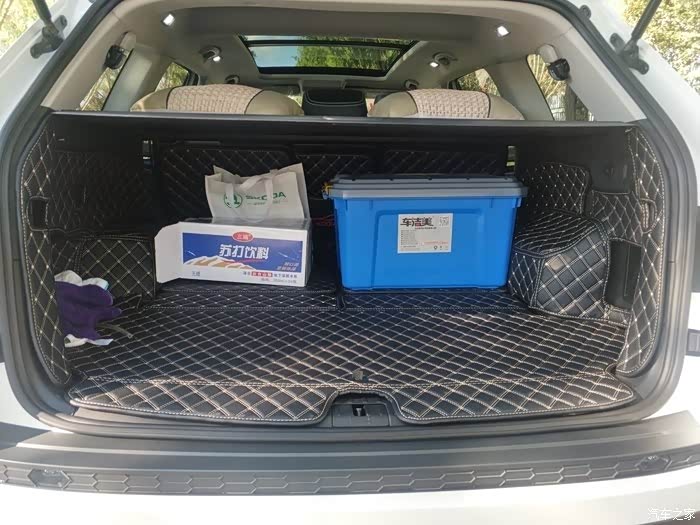 前排中间空间不错,扶手箱高度可调,加装夹层后可分类储物。方向盘左下角储物盒非常实用,放证件零钱之类的,上面还有卡槽,非常不错。副驾驶前面上下2个手套箱,这个让我很意外,只是空间有点小,放不下什么大东西,前门和后门的储物空间也不错,每个门上放几瓶水根本没问题。对于后备箱空间来说,在第三排放平的情况下,空间超大,即使第三排在使用的情况下,后备箱空间也足够全家出行使用。