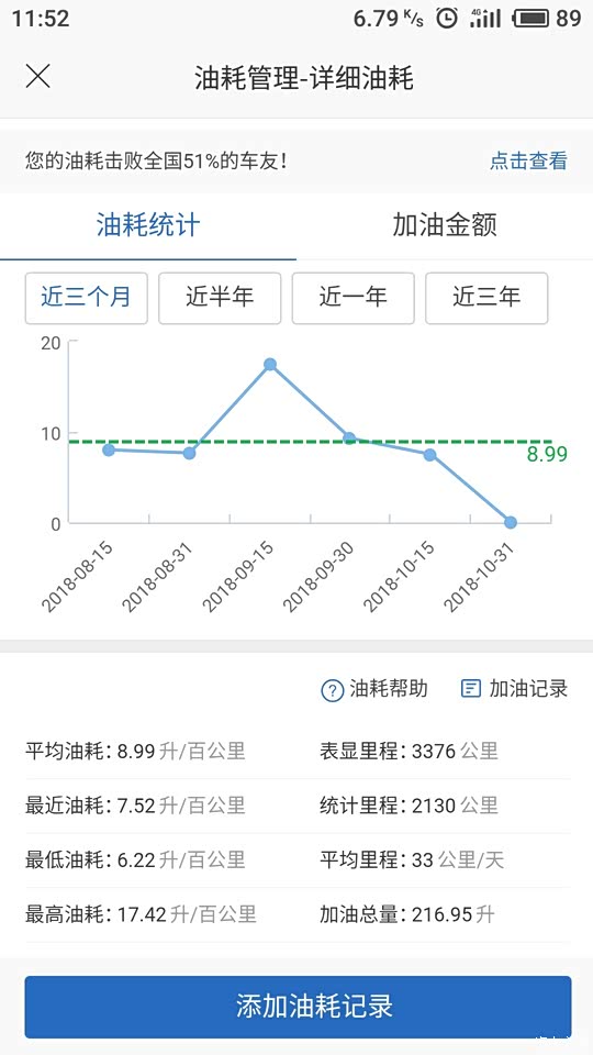 目前行驶二千多公里,高速跑了二百公里左右,其余全部在市区和快速路之间,记录了其中一部分油耗,最低7.68最高11.29这只是一部分六百多公里中记录的,总之感觉还是费油,刚提车第一个月是自己粗略算的达到13个了,第三个月用软件记录平均8.5个了,月底25号刚保养的,保养完之后感觉又费油了,表显剩余227,跑十几公里,表显160了,吓我一跳,这期间都是市区,具体刚保养别的地方还没跑。有待实验。