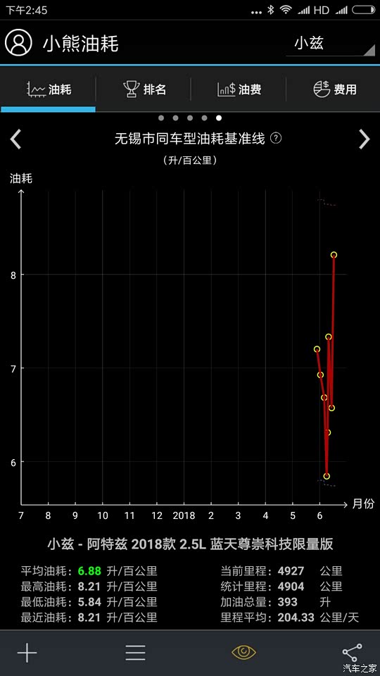 阿特兹的颜值不仅是年轻人喜欢,像我这样的中年大叔也是被深深的吸引。最满意的还是这款车的油耗,目前行驶5200公里,表显6.9L/百公里。表现非常满意。