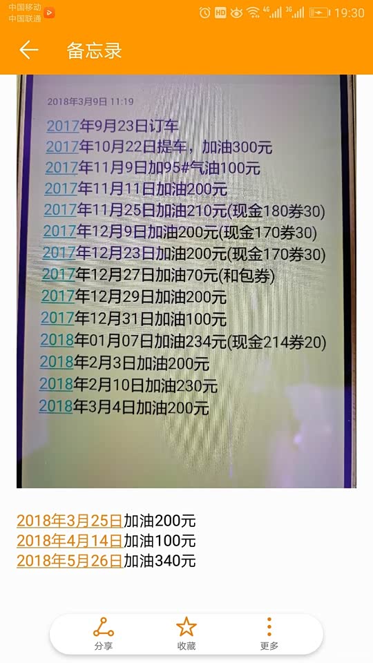 90%的路况都是拥堵的市区,平时上班车程大约10分钟左右。一直加的是95#汽油,大概一个月加一次油,每次200~300元,从买车到现在总共的油钱准确数字如下图所示:
