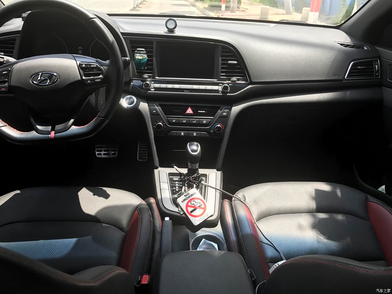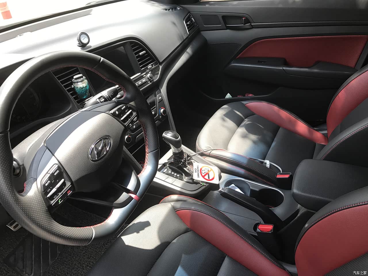 新车的时候有点味道,多打开窗户,最好能够在露天的情况下一边晒太阳一边打开窗,这样晾几天散味会快很多,黑红内饰配上红色安全带看上去很特别,中央扶手没有伸缩差评,不过这个可以后期再加上去。