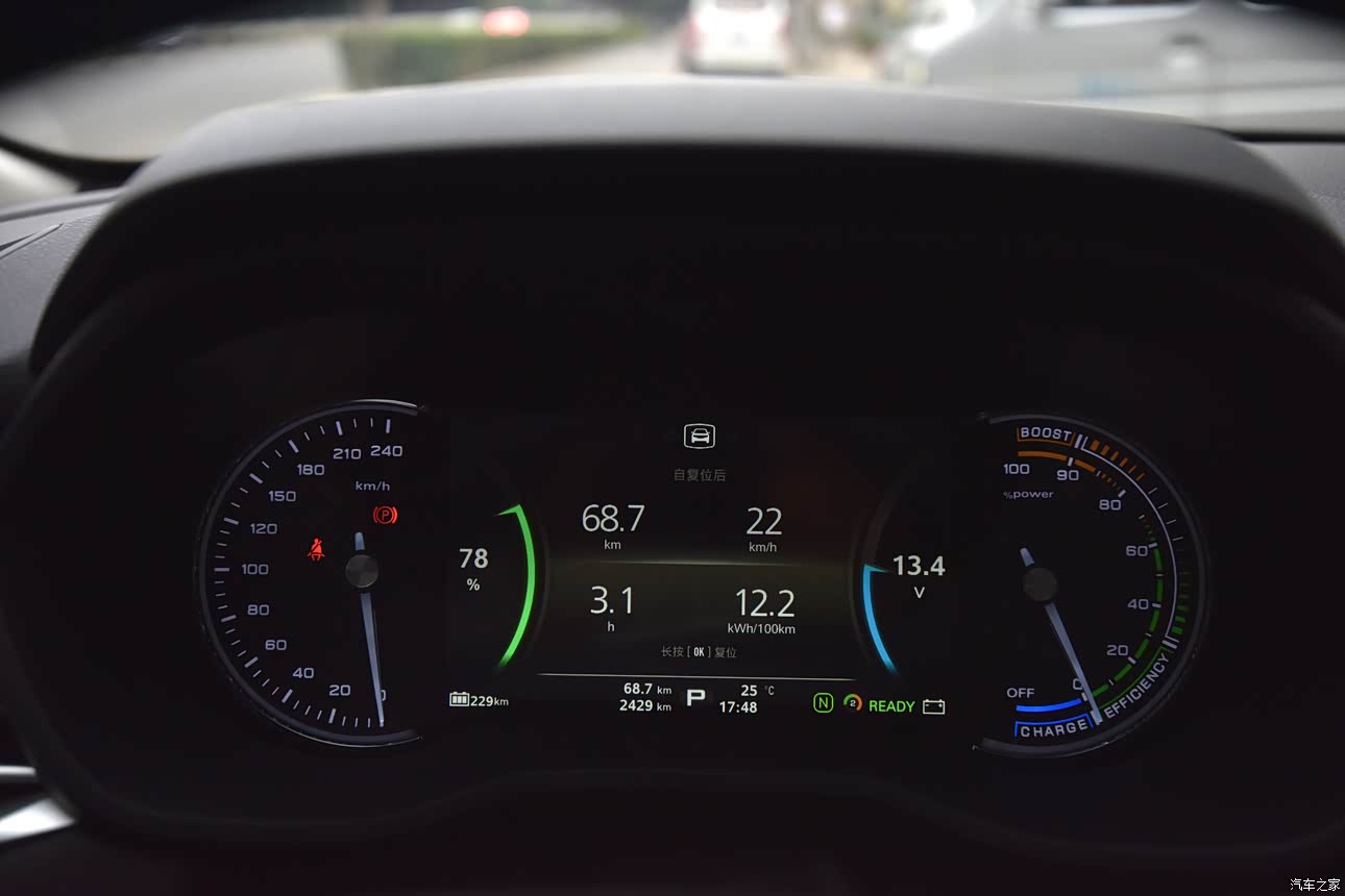 跑了68.7km,续航还剩229km,百公里耗电量12.2度。