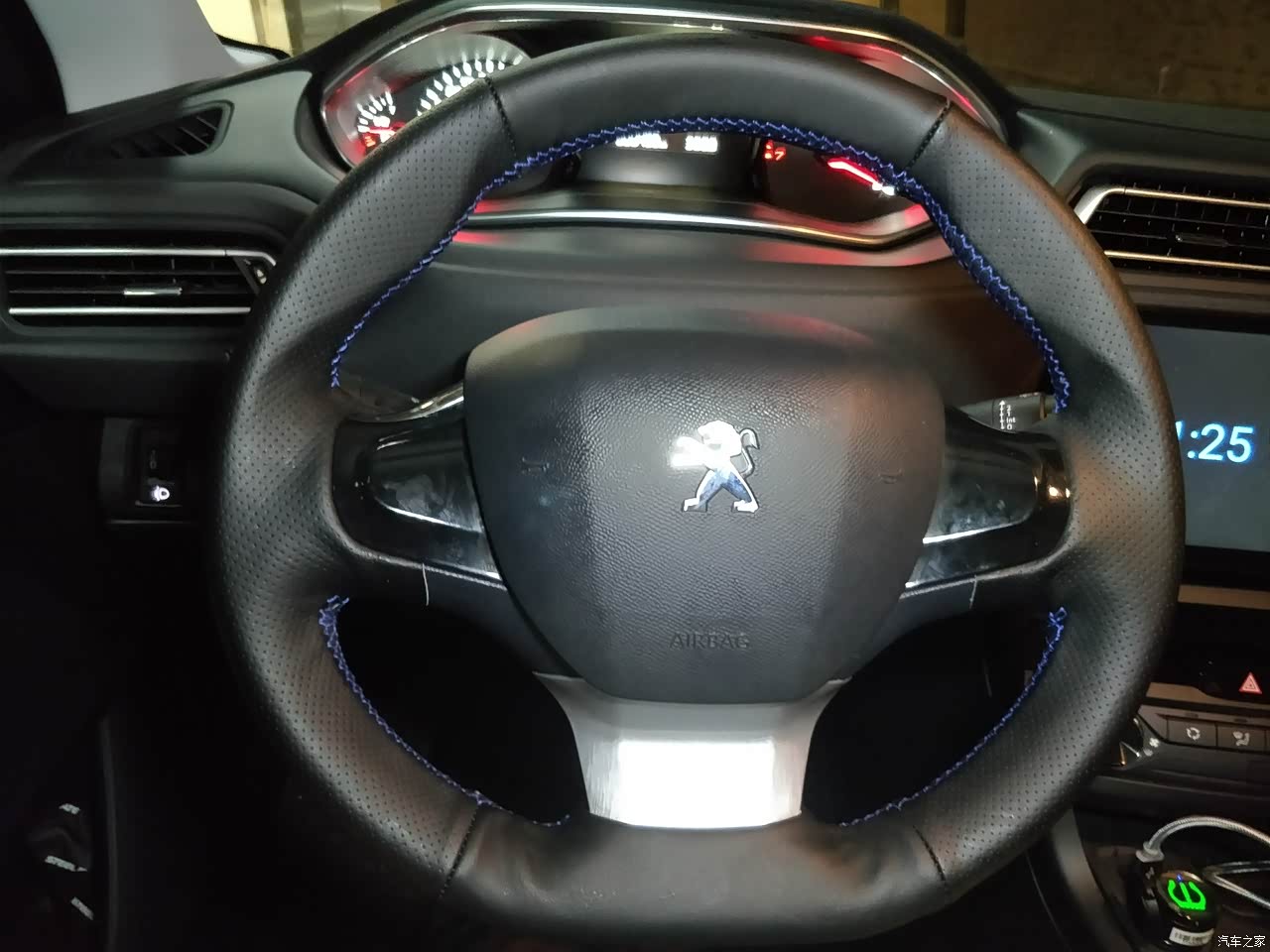 内饰比较简洁,但档次并不低,中控台上面一整片都是软材质,都不用考虑买垫子了。四个门板上靠手的部位都是皮质材料,比较有良心。座椅虽然是织物,但花纹风格还是挺搭的,暂不考虑加椅套。前面两门门和方向盘把自己拿银色金属拉丝膜装饰了一下,还有亲手缝的蓝线皮质方向盘套。