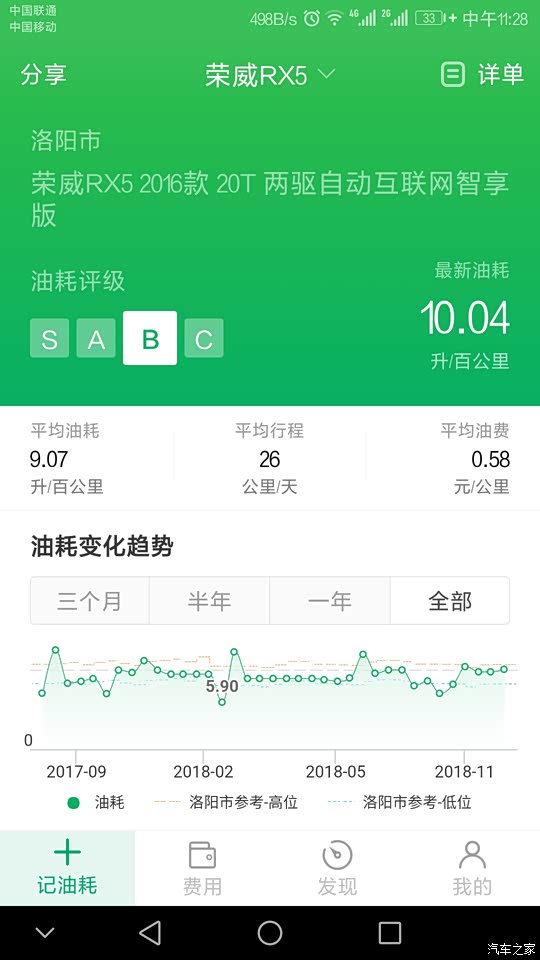 目前跑的大概3成拥堵市区,6成快速路,1成高速,油耗9个。因为之前首保在4s用号称原厂机油,据说很垃圾,油耗高。后来二保换了全合成,看看效果如何
