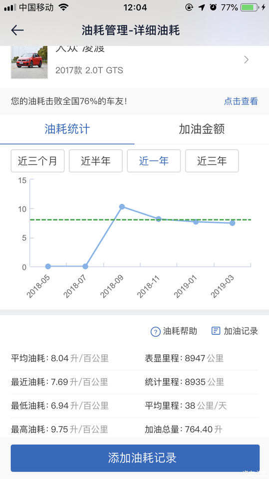 人家都说2.0T的车子油耗都高,但是目前我的车开起来平均都在8L/100km左右,跑了9千公里了,总的平均油耗是8.04升,最高的时候跑的9.75升/百公里,最低的时候跑的是6.94升/百公里。朋友都说我开的是假的2.0T,其实油耗跟每个人的驾驶习惯、路况、拥堵情况是有关系的,可能是我开车比较佛系!