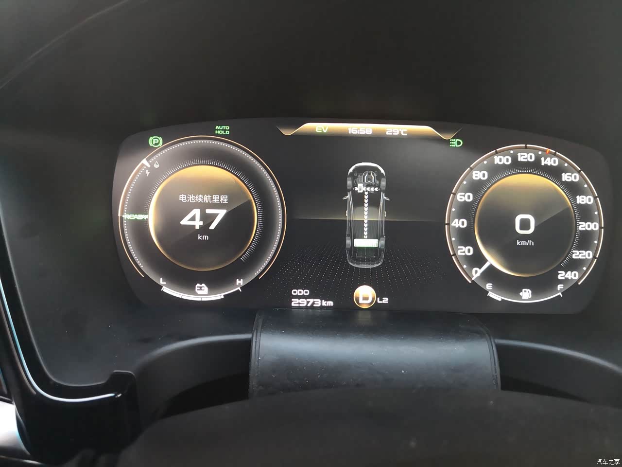 每天上下班大约50公里,市郊各一半吧,还经常打晃,公司里随车慢充,从早上到公司到下午,7个小时里面肯定充满了。现在不开空调的情况下,纯电续航在46公里左右,还是有点不太理想。前一半的电比后一半的会经用一些,一般前30公里的续航能开个26-28公里。前一阵使用空调的情况下更少点,也就只有40公里左右了。