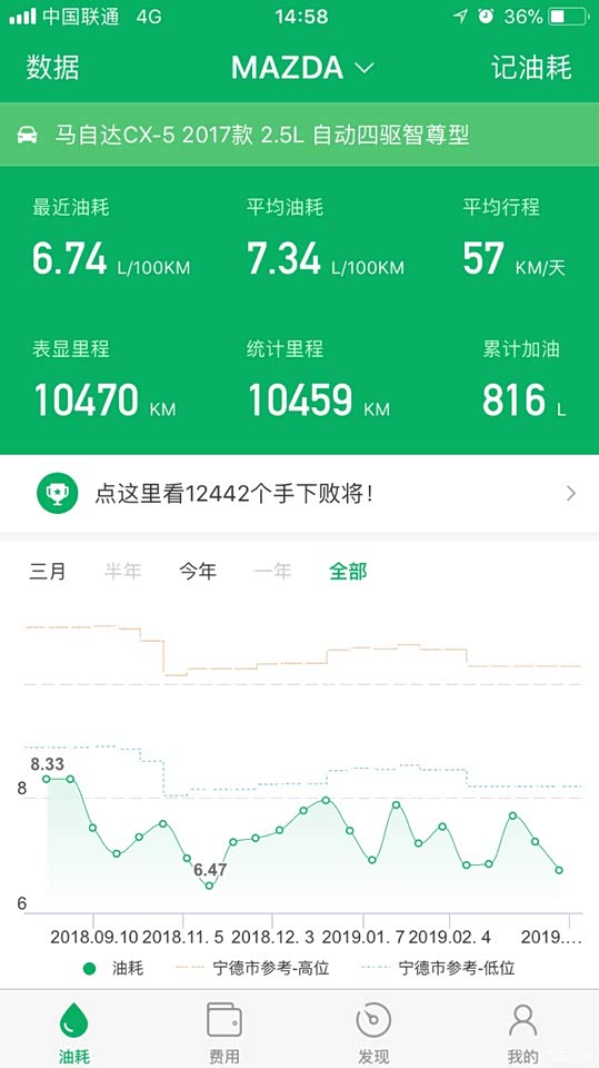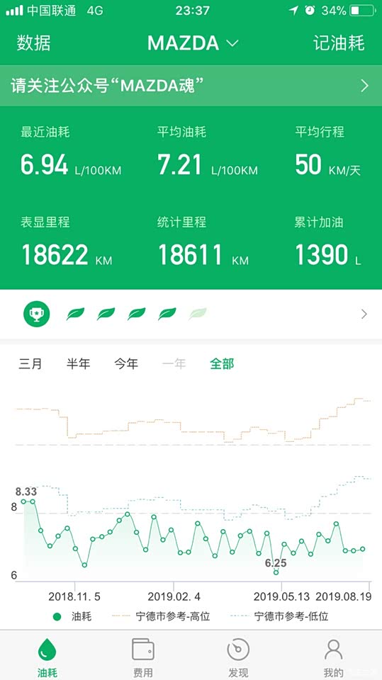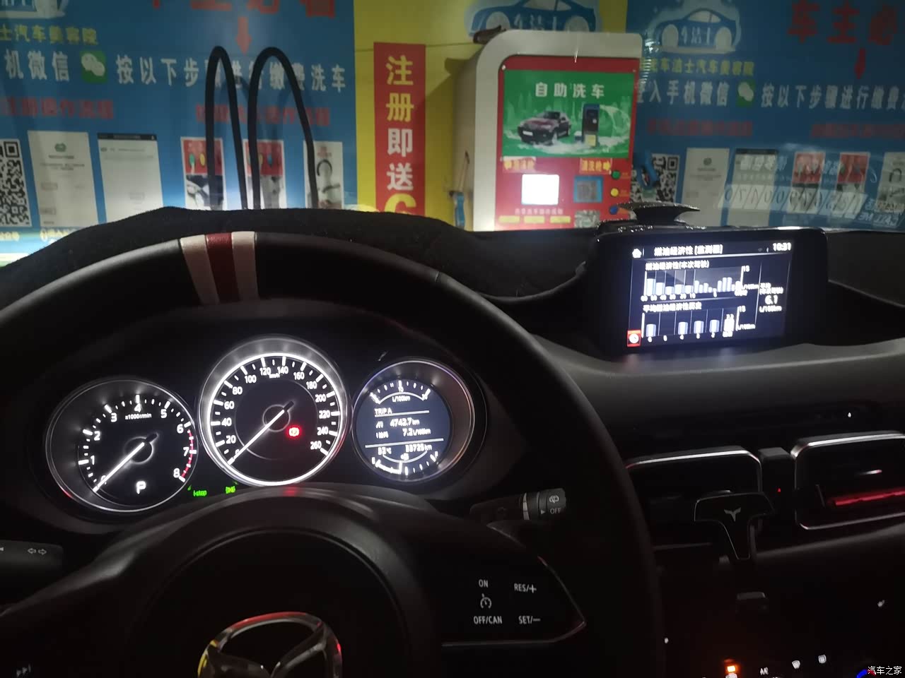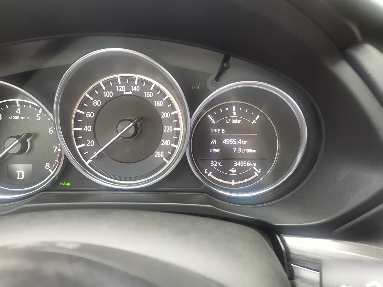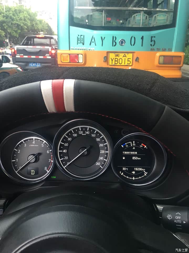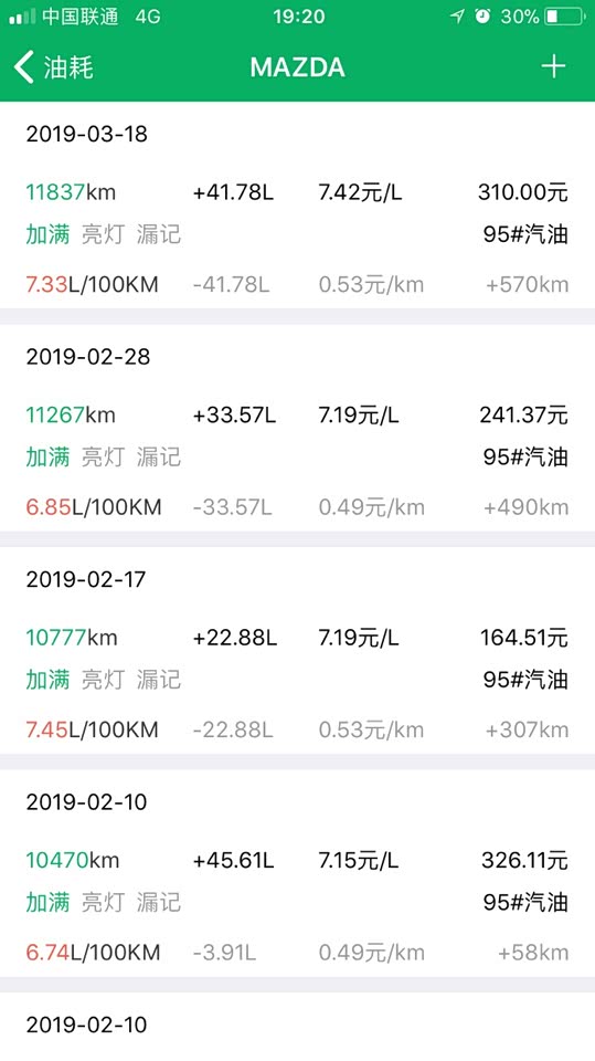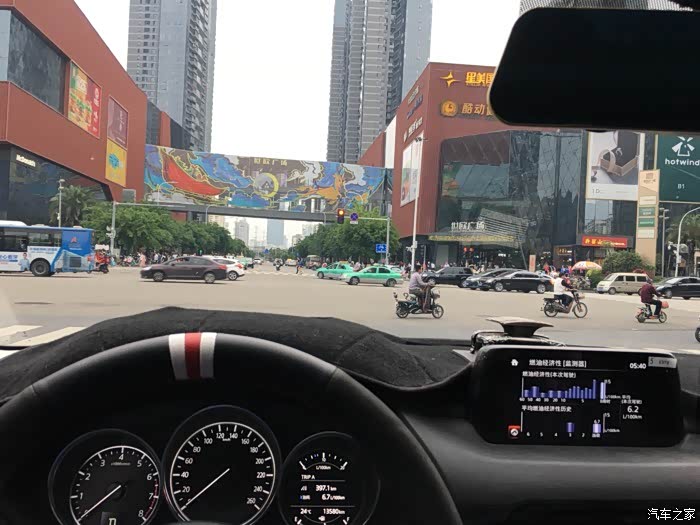 因为经常高速和郊区,所以综合油耗从提车的三十多降到了7.7。加的95汽油,一个月两次吧,油箱没有官方给的58升这么大,感觉这油箱大概52升左右。一直用小熊油耗记录,数据和表显油耗还是很吻合,平均一公里六毛的油费,油耗目前还是很满意的!创驰蓝天技术确实是牛逼,发动机的高热效率、变速箱的全速域锁止,底盘的轻量化,用低标号机油,普利司通轮胎高效率滚动性,点火启停功能,不吹不黑,马自达发动机油耗在同级是数一数二的。