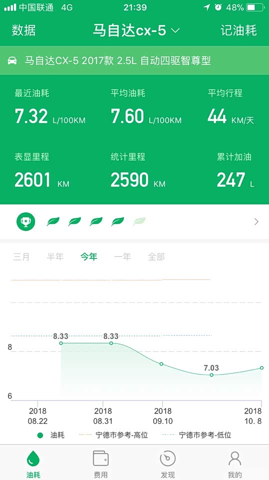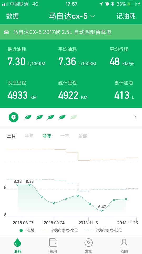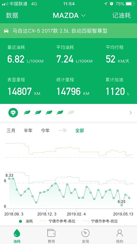 日常大部分高速郊区,所以综合油耗并不是很高。7.5个油,高速最低跑过5.9。市区看拥堵情况啦,最高18个油。