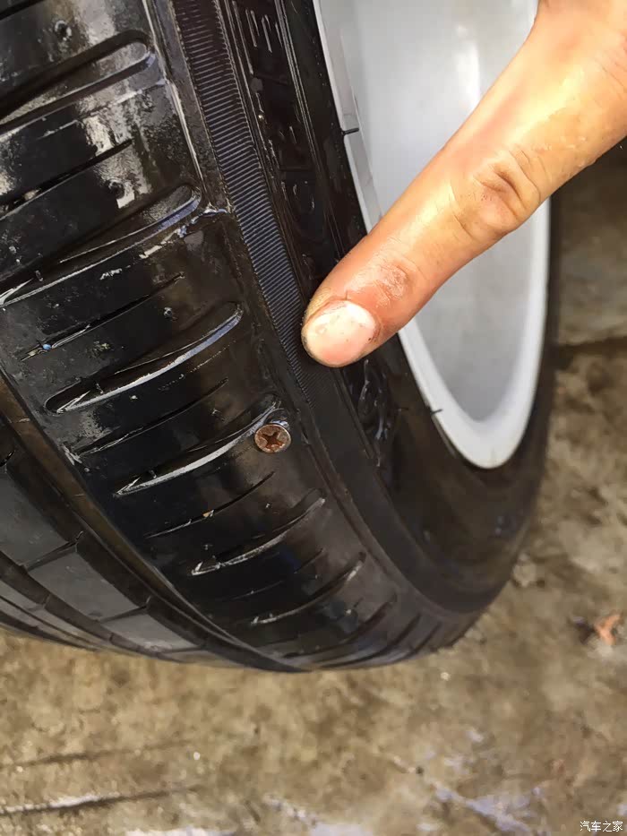扎钉子,而且正好是首保后,显示胎压低,一直搞不清楚原因,后来群里老大说扎钉子了,侧面,补了蘑菇钉