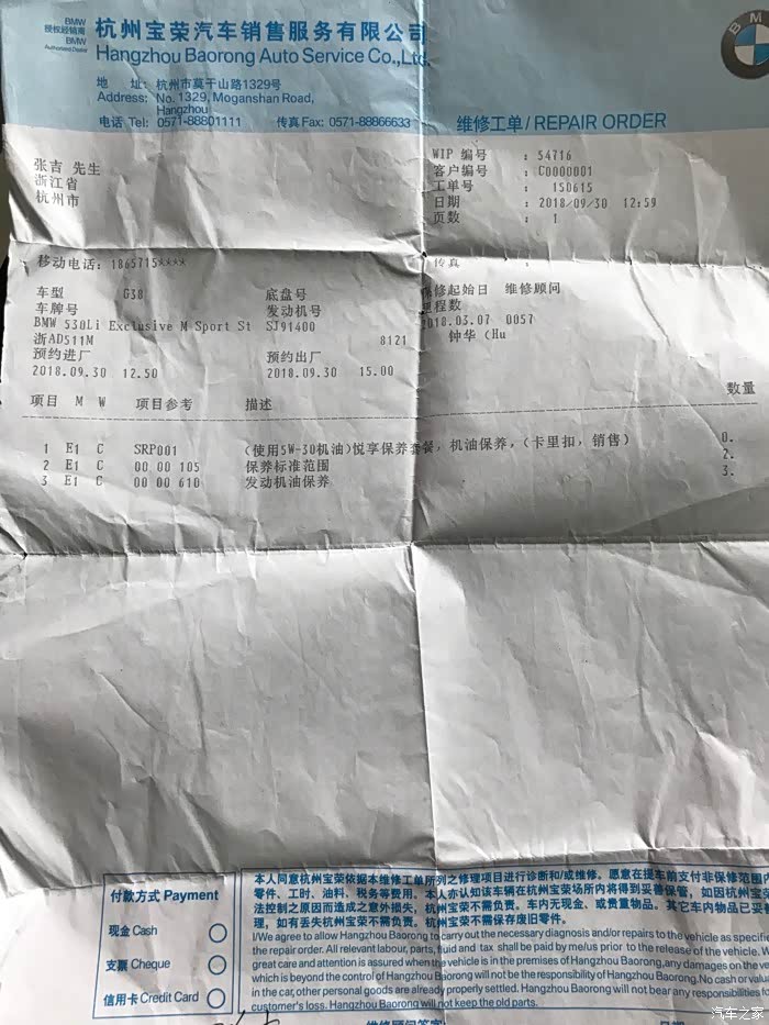 常规小保养,机油机滤,没花钱,因为宝马置换宝马,送了三次常规保养,还有一次介绍朋友买宝马送的,所以近两年保养估计不用钱