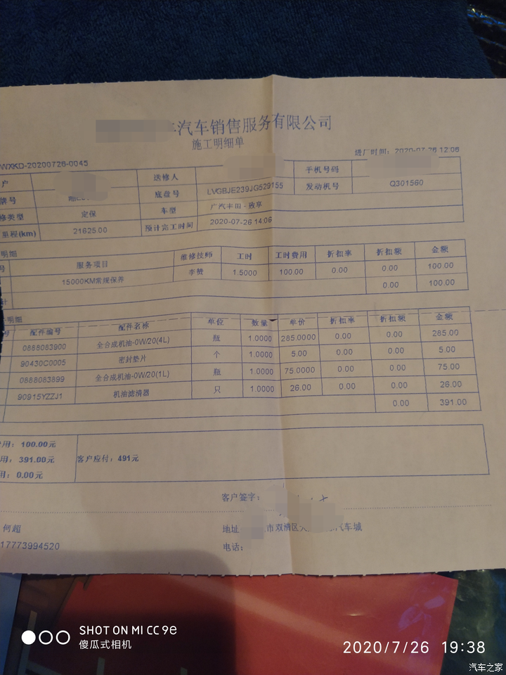 这是第3次保养,去年的12月做的第2次保养,因为换的是0W-20的全合成机油,所以完全可以在10000公里或者1年再去保养,8月份保险到期了,和店里谈续保,店里对于续保的有活动,赠送一次包含工时和材料的保养一次,4轮定位一次,礼品若干,所以这次去店里续保顺便就把保养做了,8个月里程是6千多公里,反正今年就做这一次保养了,续保送的这次保养留着明年做了,日系的保养周期长,费用也低,符合家用车的标准,这也是丰田车的优势!