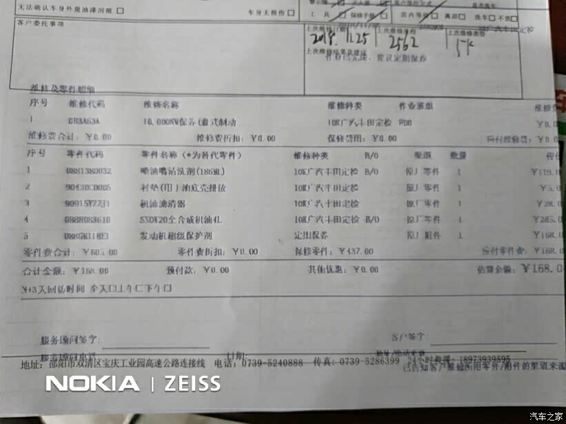 10.25去了首检,店家工作人员很是热情,因为我去的早,所以我是第一个做的首检,没有排队,上架工作人员看了底盘,轮胎,发动机,变速箱,刹车片,。。。。正常!打开引擎盖,量了电瓶的电量,加了玻璃水,防冻液没有少就不需要加,机油也没有换,因为要到6个月或者10000公里才换的,机油颜色正常,也没有少,正常!最后发现有根空调管有点泄露的痕迹,工作人员说先洗干净了再看看,如果还有的话下次做首保的时候就换掉!其他一切正常!最后还洗了车,都是免费的!