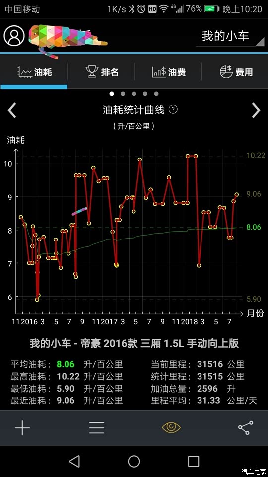 目前开了32000左右,一直有用软件记录油耗,一次没拉下,累计平均8.06L/百公里,但实际回老家近两年的油耗应该不会低于8.6L/百公里,看下曲线图就知道了。最高跑过10.22,如果当月没有出游跑长途,油耗不会低于8.5。