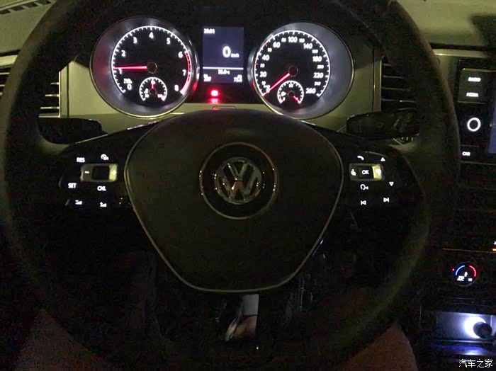 虽然是大众家族化内饰,没有太多亮点,但是耐看,看着也大气,太过出彩的东西容易审美疲劳。用料来说作为这个价格很满足呢,仪表盘全部软性皮质,门板和手套箱里面还有植绒,夜晚脚部和门板还有氛围灯,好看。