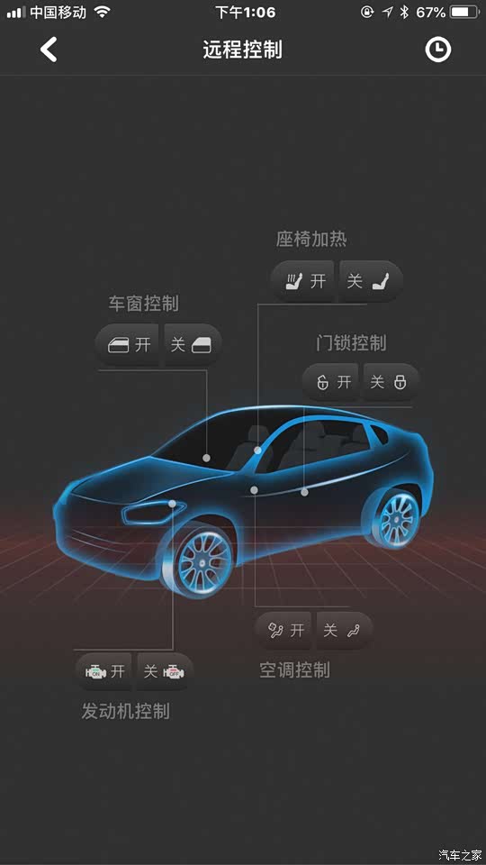 远程控制功能:发动机启动开关、座椅加热,空调开关等。夏季可提前开启空调,冬季打开座椅加热,舒适便利。