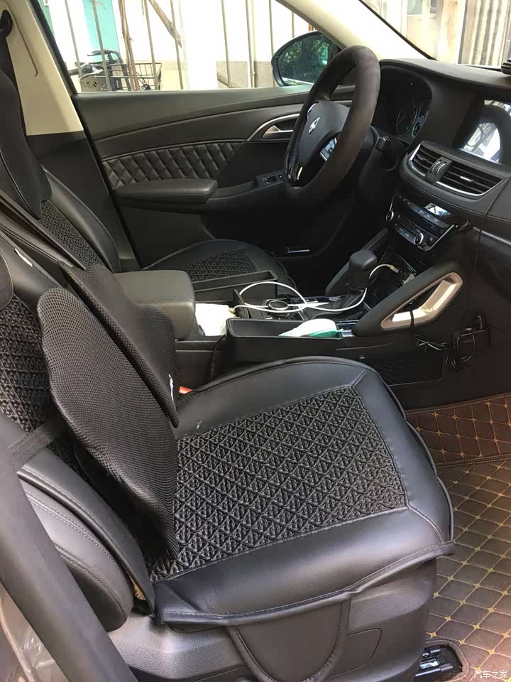 内饰用料比较柔软,凡是身体能接触到的都用软性材料包裹,座椅是纳帕皮菱形制作的乘坐舒适、透气软硬适中。