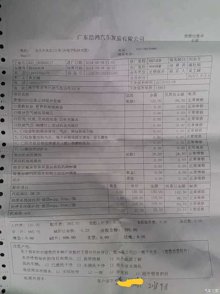 第二次保养在服务站做的做了机油更换机滤,还有一个发动机清理清洗,总共是468块钱,然后折工时费折扣之后是406块。