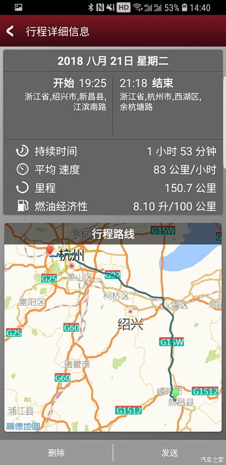 高速我基本上在160左右,所以可以看到平均时速也有八十,油耗让我比较意外,因为那天开的是临牌,所以其实还算是快的,平均速度因为算上了市区,所以才会比较慢