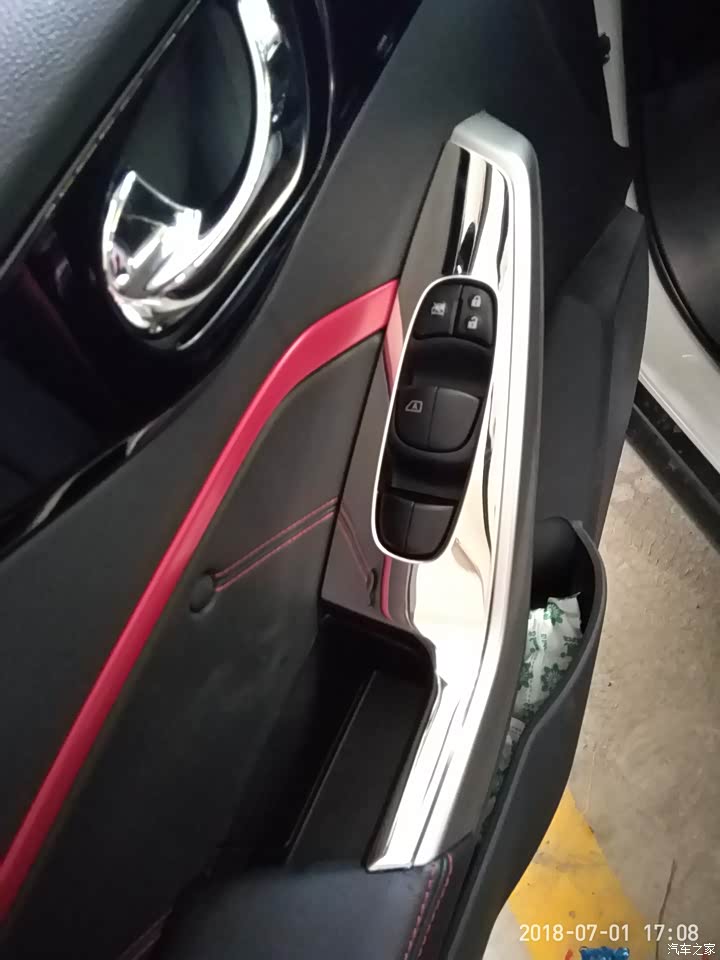 内饰的风格还是很不错的,红黑格调,比较上档次,中控也比较漂亮,稍微装饰一下就更好看了,某宝上有,很便宜。不满意的地方就是新车有点异味,还在可接受范围内。