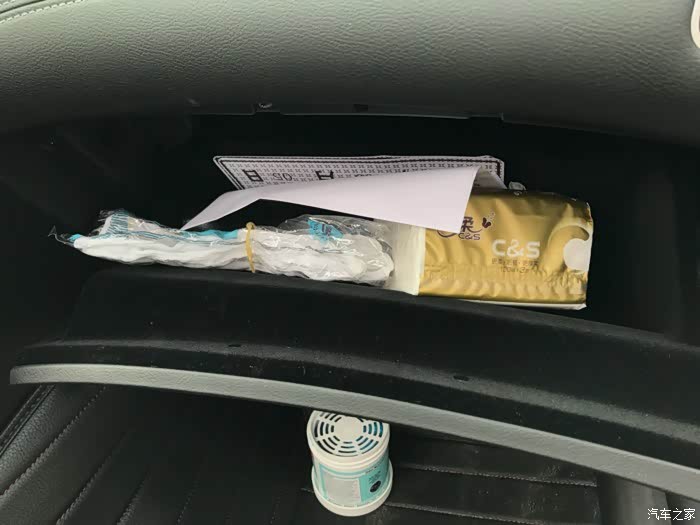 车内储物空间比较尴尬,除了基本的杯架外,扶手箱和手套箱都很小……
