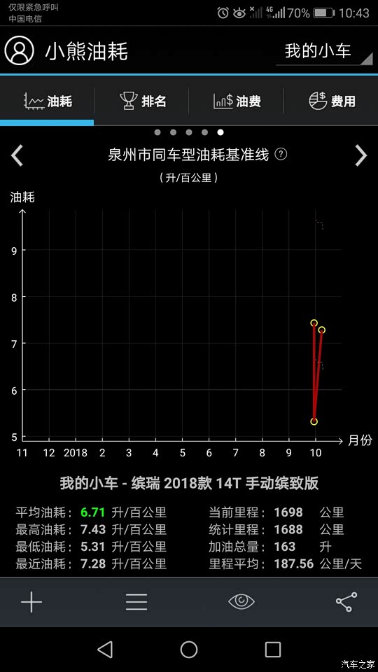 目前行驶了2000公里左右,仪表盘显示6.4,我实测了,大概在7.3,下图是我用小熊油耗测的,你们可以看看,虽然前1500公里基本是跑高速,但也有市区拥堵路段,个人还是比较满意。