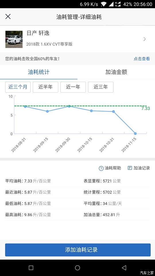 2018款新轩逸尊享版目前4500公里油耗6.5L/百公里