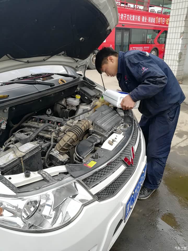 细心工作中的4S店工作人员,在认真的给我车更换防冻液,工作很认真负责的小哥,点赞