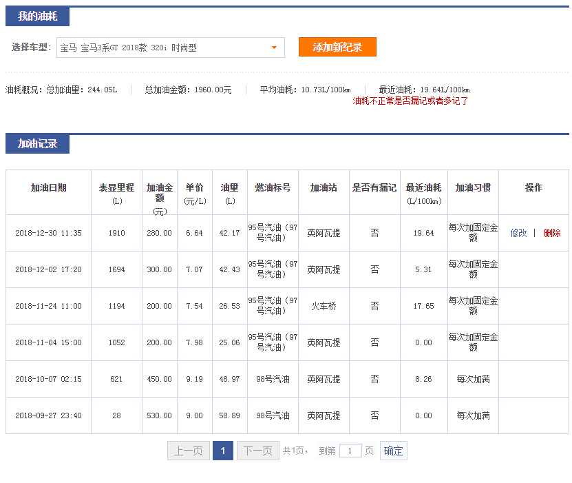 一箱油满油行驶621公里后再加满。加了450元/621公里=98#油实测0.72元/公里。第一箱油加了59升加满大概能跑个750公里。现在车辆行车电脑上显示的平均油耗是8.0升。