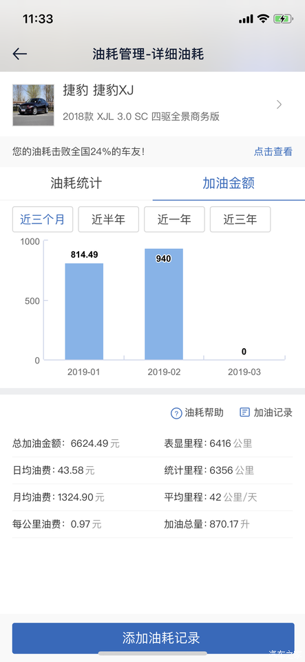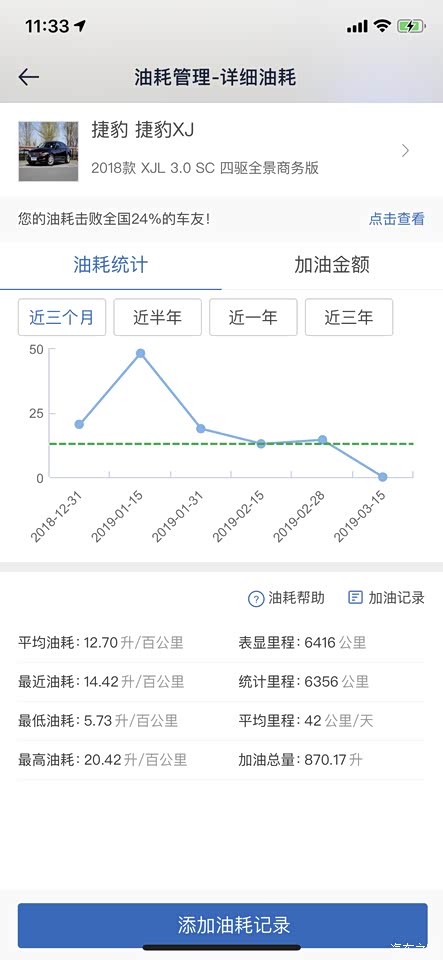 在汽车之家记录的显示平均油耗12.7,但我觉得没这么低啊,感觉市区不低于15-18,高速不低于10-12。前期2000公里内没敢撒丫子乱跑,基本控制着车速,且速度不超过100,这段时间是拉低了平均油耗的。这边比较冷,零下10度以下经常油耗50以上,吓死人。