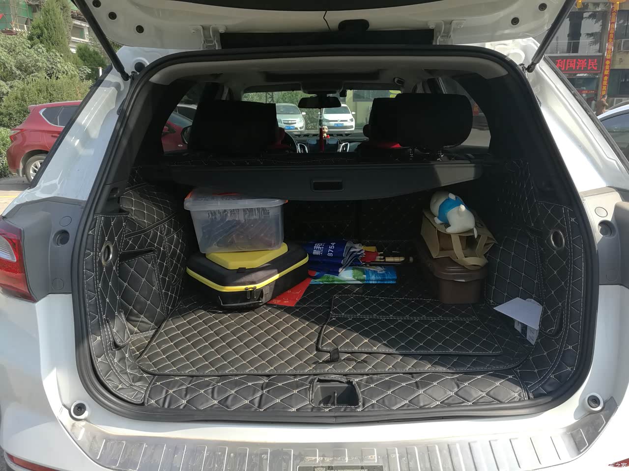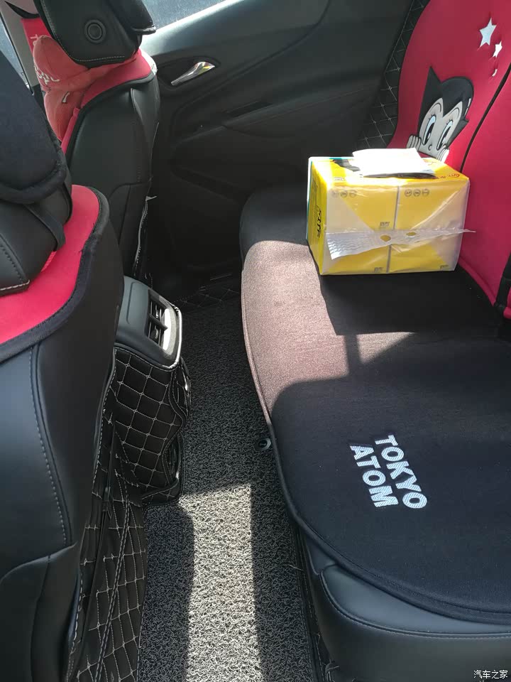 后排座椅上的那个大窟窿太难看了,果断用座垫挡上,还有就是内饰塑料感太强,买了个全车大包围,把能挡的地方全都糊住了。