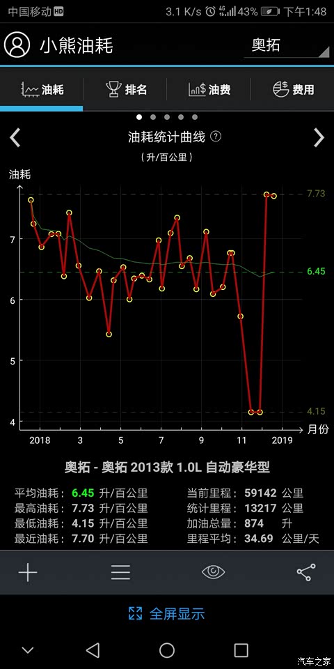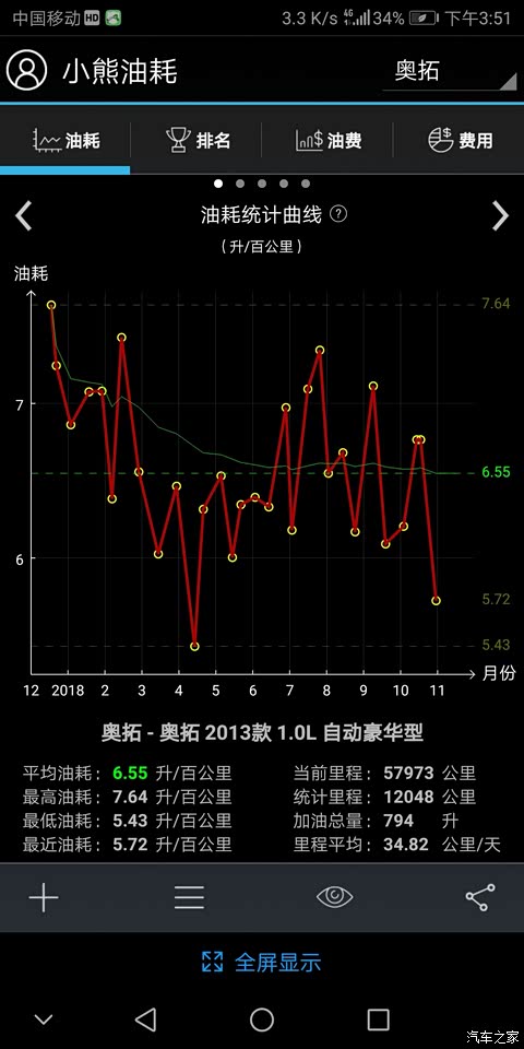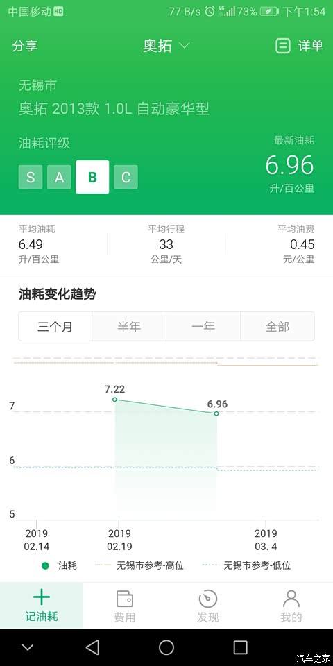 冬天过去了,油耗也降下来了,整个冬天油耗维持在7L/100km的之上,最近一次低于这个油耗了,每天上下班13km国道路况,大车多,急加速,急刹车也比较多,总体油耗还是偏高的。