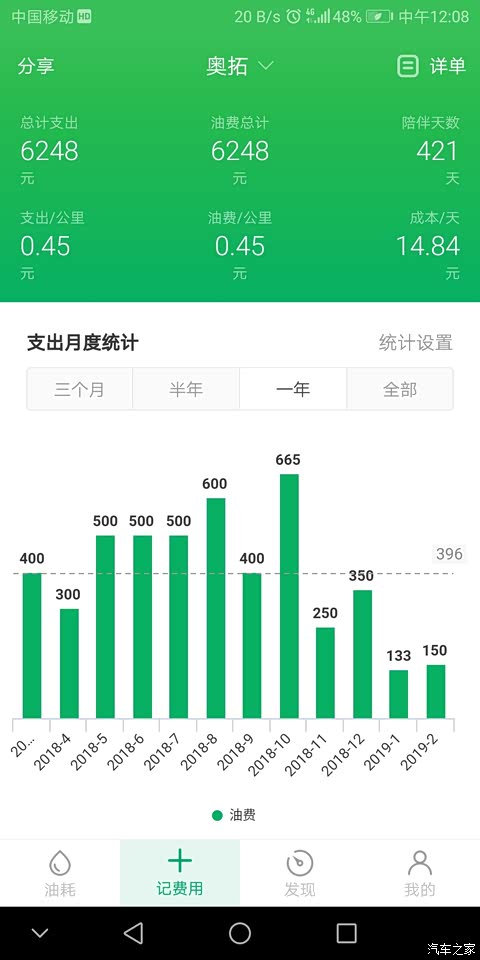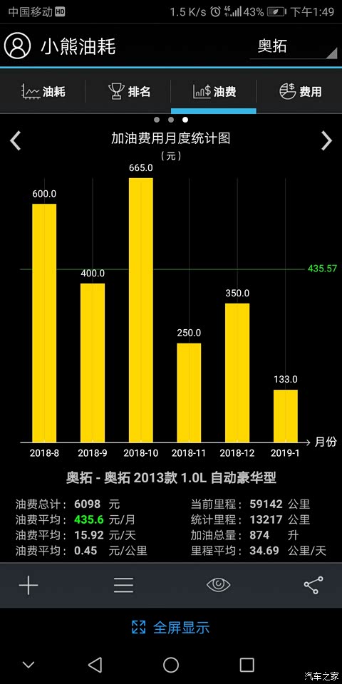 冬天了,油耗略高,基本维持在7个油左右,一方面是冷启动达到水温正常时间更久,另一方面开暖空调也会增加油耗,反正也就1.0排量,这阶段油价也还便宜,使劲用吧,分享下我整个2018年的油耗表现以及加油费用,总体来说,小奥拓的油耗我还是满意的😂