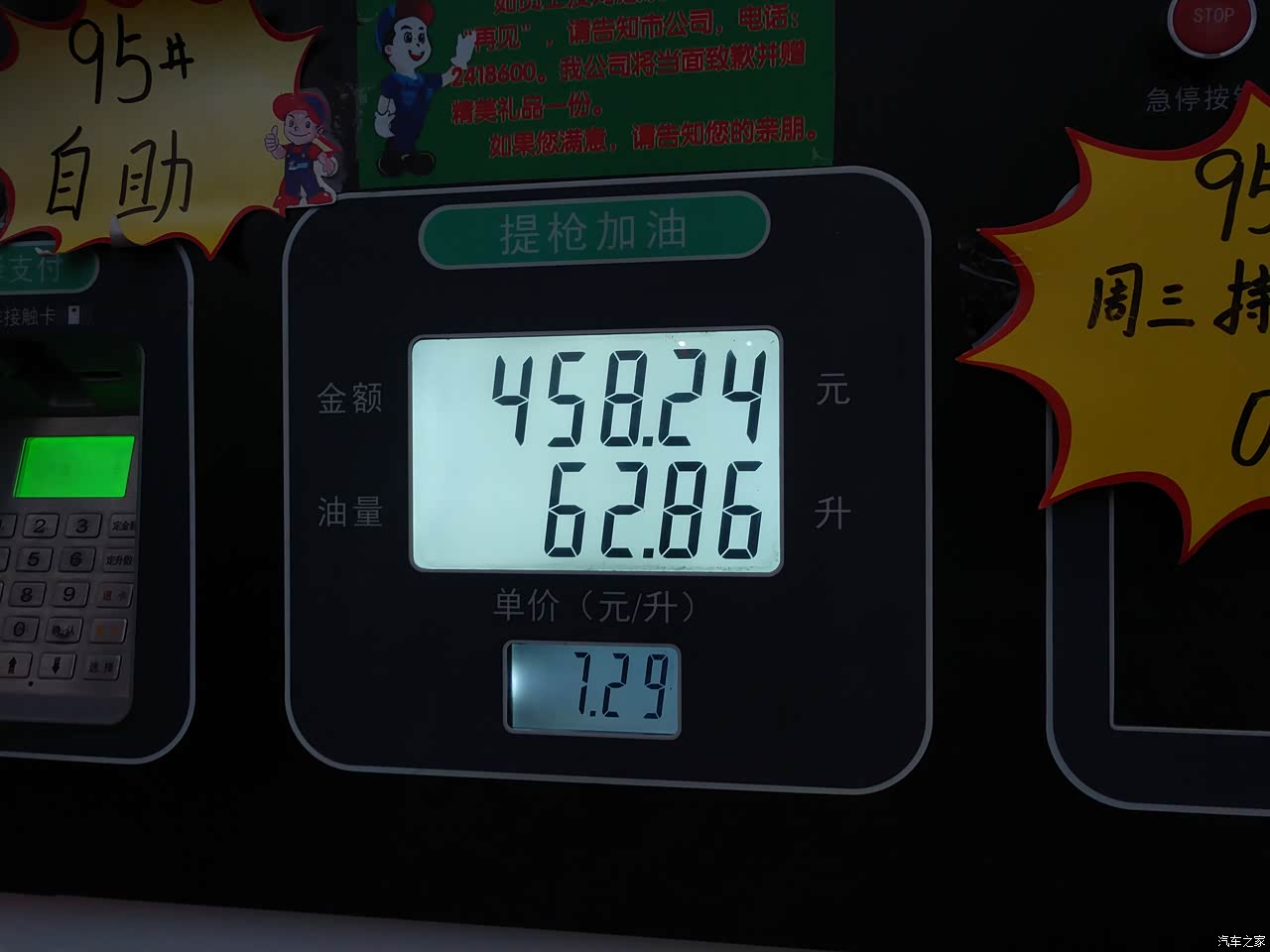 趁这次加油观察了一下油箱大小,还剩100km续航时去加的,按百公里7个油算的话,还有7L油,加到跳枪是63L,也就是油箱最少在70L
