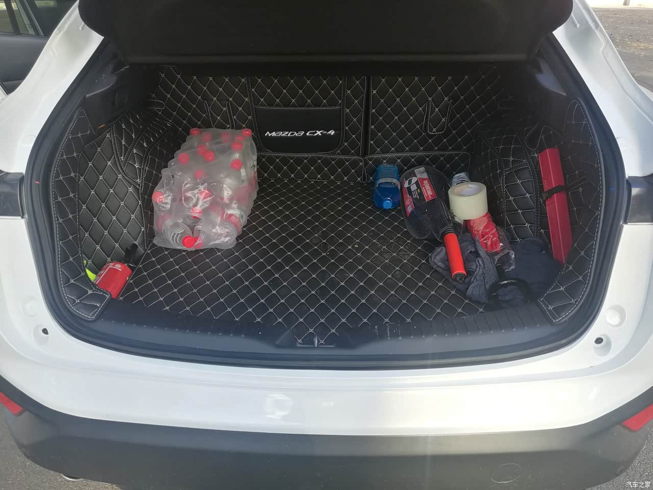 后备箱储物空间很大,我平时都放一件28个的农夫山泉占的地方在图里可以看到。