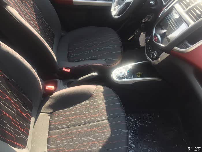 内饰是红黑相间的,对于这个价位的车 内饰用料上没有什么过多的奢求,而扎实的装配工艺令人眼前一亮,仪表板上的按键用力按下去都不会有任何的松散。
