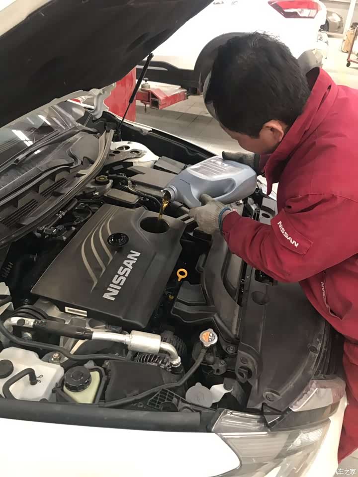 师傅正在添加免费的矿物质机油,不想加钱上半合成机油。