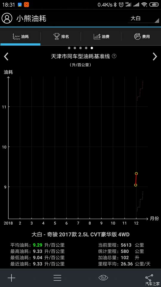 油耗不错,要是纯市里的话平峰10个油。早晚高峰 13个油,高速郊区市里一起的话9个油,纯高速的话匀速每小时100公里㎞也就7个多点油