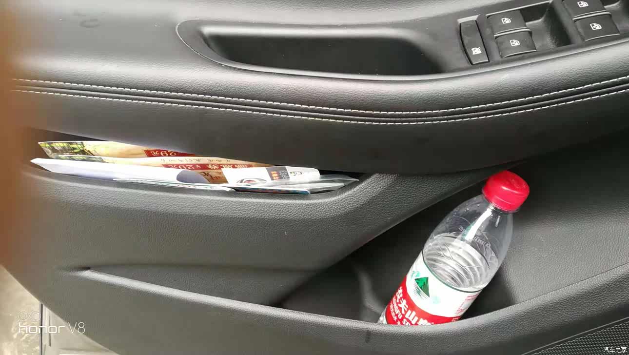 储物空间非常大,特别是扶手箱大到你无法想象,门板上的空间我还嫌大,放上一瓶水关门还晃动,唯一要吐槽的就是手套箱比较小,装不了太多东西,不过也还够用。