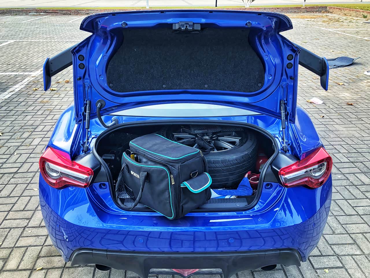 小蓝是4座车,应急的时候4大人也是可以的,储物空间不少,后备箱够大,能放两个轮毂,一个大工具包,一个中大千斤顶,这对一台跑车来说已够用了,很完美!