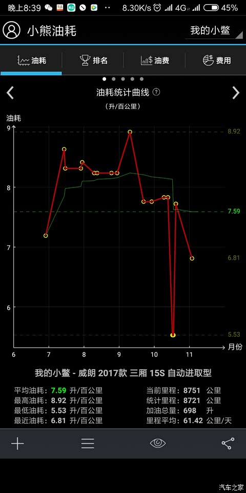 油耗还可以,我走省道较多,开车不算猛的也不算省的,油耗能达到7.5,附一个小熊油耗记录
