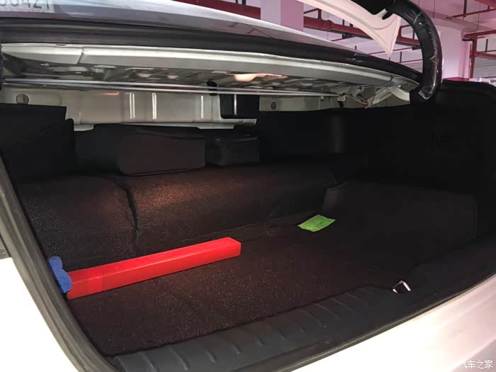 后备箱的空间就比较捉襟见肘了。一个24寸的旅行箱,两个双肩背包,下面就填满了。另外,后备箱没有备胎,但是随车附送了气泵和补胎液,也算是可以应急。