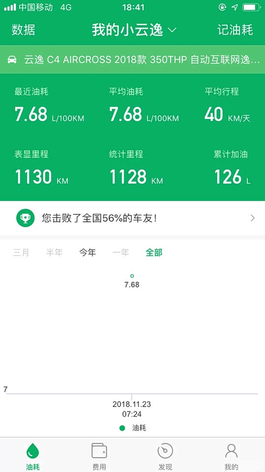 目前开了1057公里,高速开过,市区开过,郊区开过,今天去练车,山路也开了,总共加油了上次,目前显示油耗7.68L