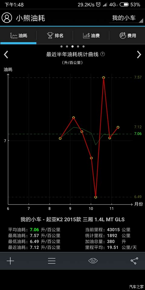 综合油耗7.几。跑了4万多公里 现在划五毛多一公里