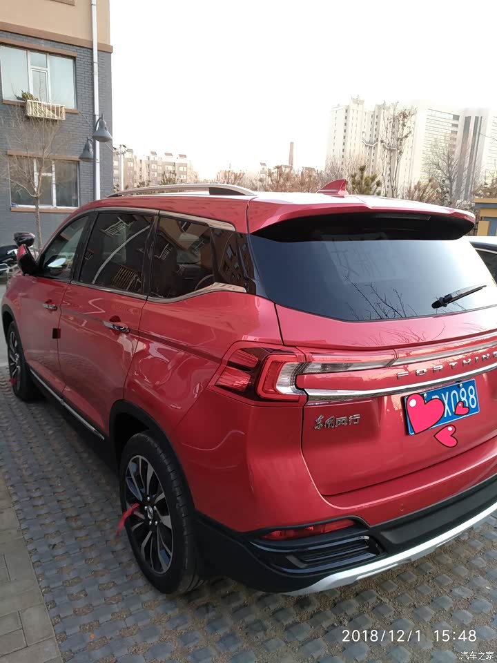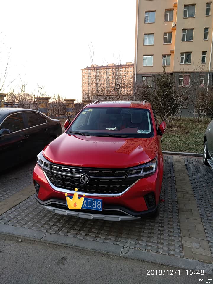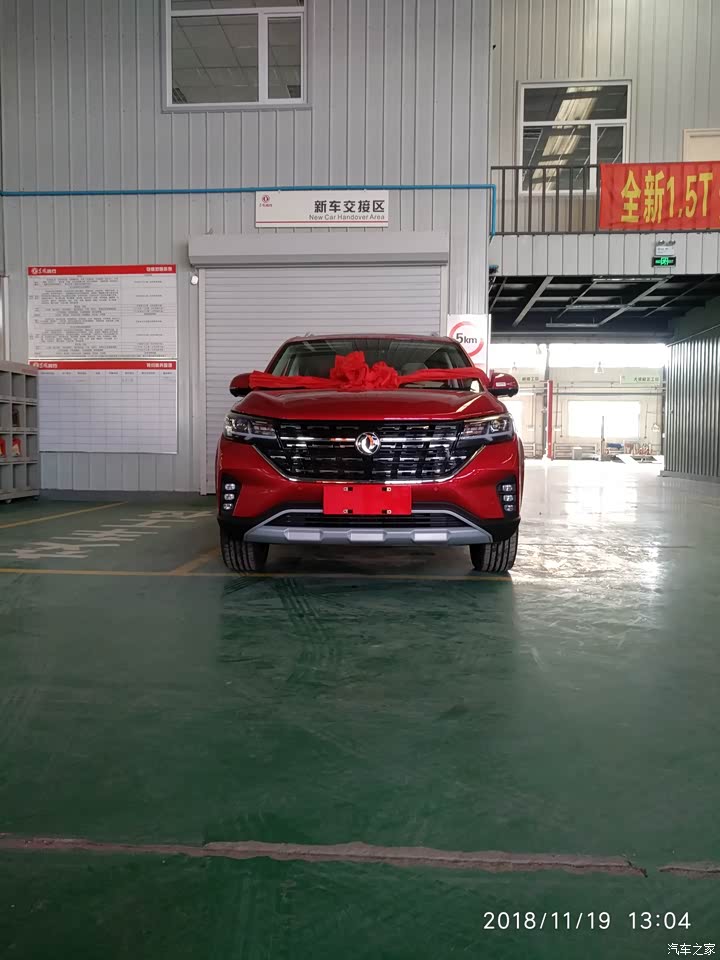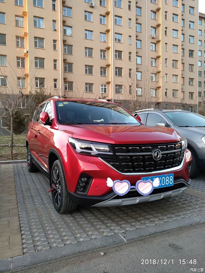打算买车以后看了不少车,最后锁定几款,比如猎豹cs9,长城哈弗H6、H4,吉利缤瑞、缤越,传祺gs4,还有就是看到报道即将要上市的风行T5,风光580,最后根据个人买车预算,颜值,功能配置等,还是选择了风行T5,看了实车后感觉红色太漂亮了,最能打动我的。因为我选的1.5t至尊版没有现车,所以交了订金预定的,足足等了一个月才提到车,现在感觉,当初的选择很正确,开着非常棒,顶配车配置的是马牌轮胎,厂家很良心的!
