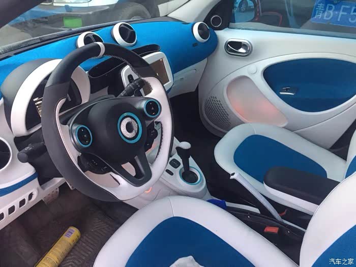 满意,蓝白很科幻,白色的Napa真皮,听名字很牛逼,蓝色的是织布,第一眼看见真的很漂亮,特别喜欢,前排座椅带加热,冬天真的很实用哦,大赞,屁股不用凉了,座椅包裹性也很好,中空说是仿生学,是一个青蛙造型,到处都是圆圆的内饰,很讨女孩喜欢??方向盘是我专门去淘宝找的黑白色的真皮材质,自己缝的,弄了一上午,挡杆也是,配和方向盘,简单好看