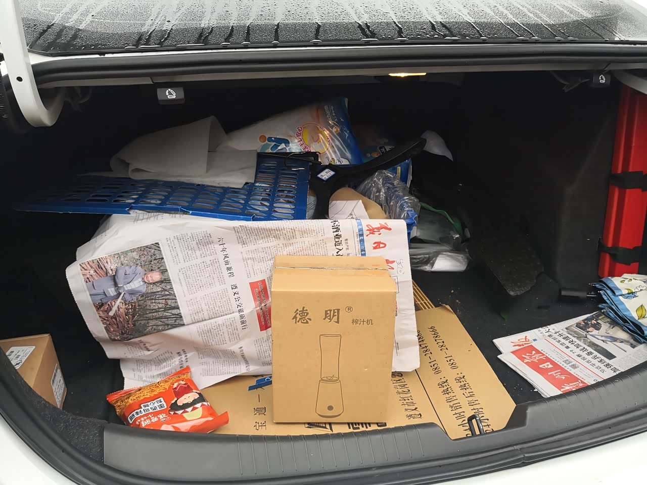 后备箱够大,本来是用来装钓鱼装备的,夫人不肯,我就故意弄得乱七八糟的。