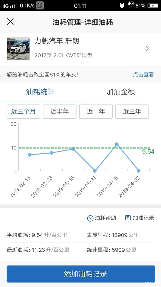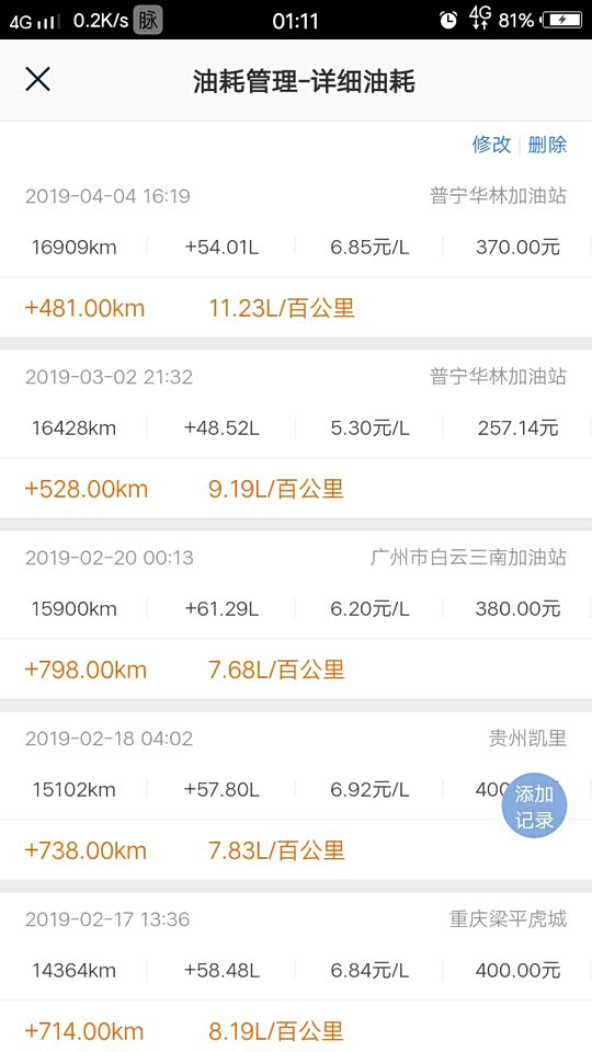 最近几次加油记录。高速都在8个以下,市区都到11个了.