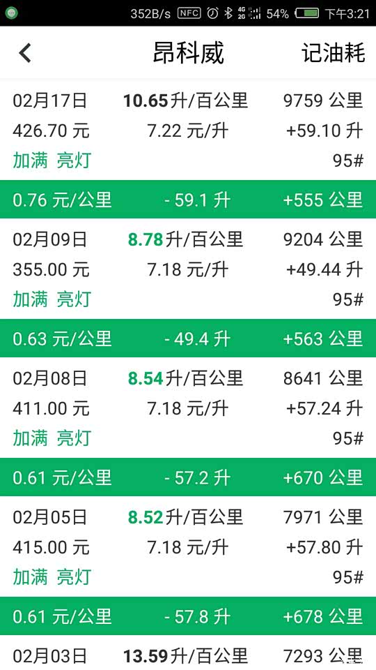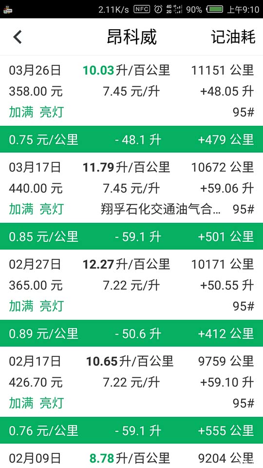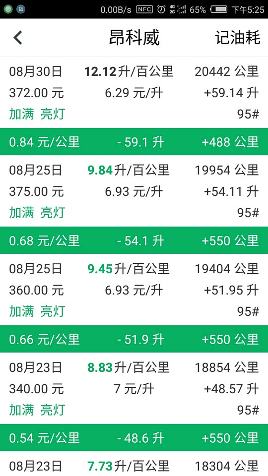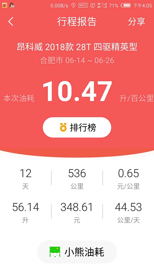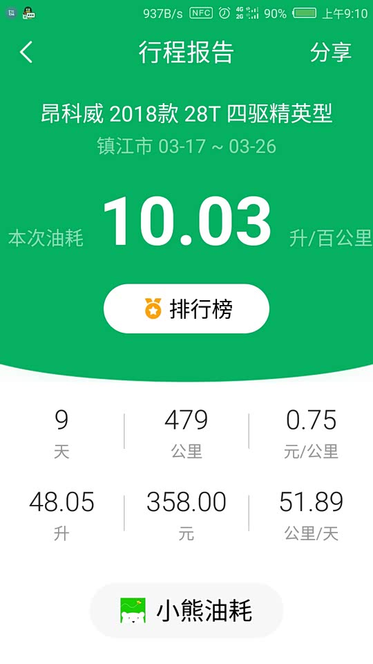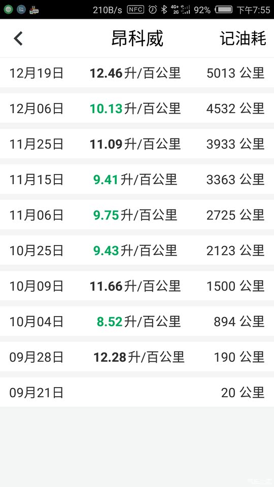 最近雨天多,长距离的比较少,5~10公里的路程多,最高一箱油跑的油耗是12.27升,小熊油耗App记录的。目前高速上的油耗是不到8升油,不错,应该是比较省的了。9AT在高速公路上的油耗表现真的不错,棒棒哒!高速下来后,城市道路感觉油耗高了不少,一箱油后有点下降,慢慢又正常了。不知道什么原因。