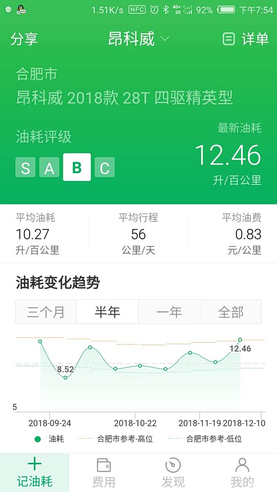 合肥这个十大堵城,市內通行的油耗是下不来了,纯城市市区道路油耗不会低于12~14之间,稍微往高新,滨湖这些有高架桥的城区跑几趟,综合油耗会在10~11之间。目前和新车油耗没啥区别: