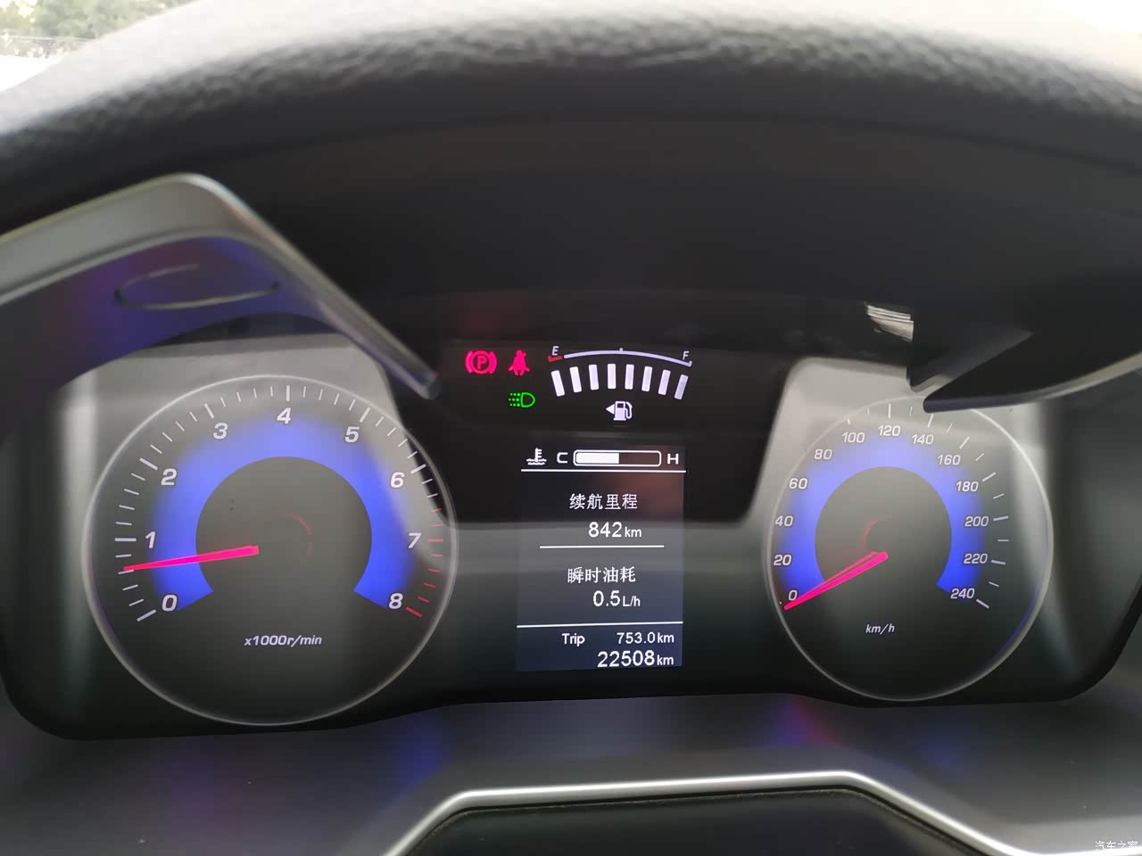 提车过后做过一些油耗记录,但是也不是经常在精确记录。一般是同一加油站,同一把油枪加到跳枪,然后开到油量指示灯红灯亮起再加到跳枪,如此记录了几次。一般跑个750-800没问题。综合油耗7个左右。